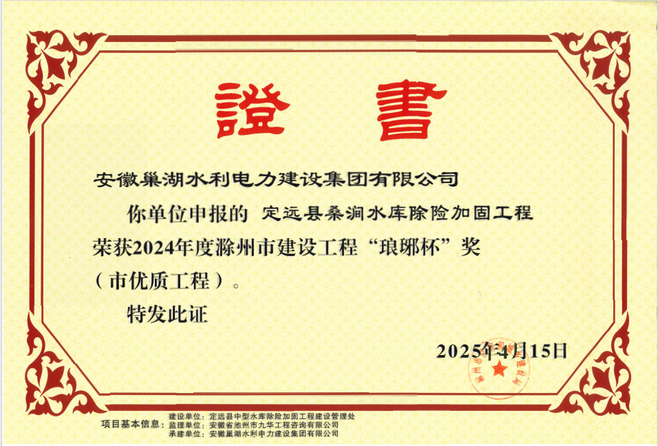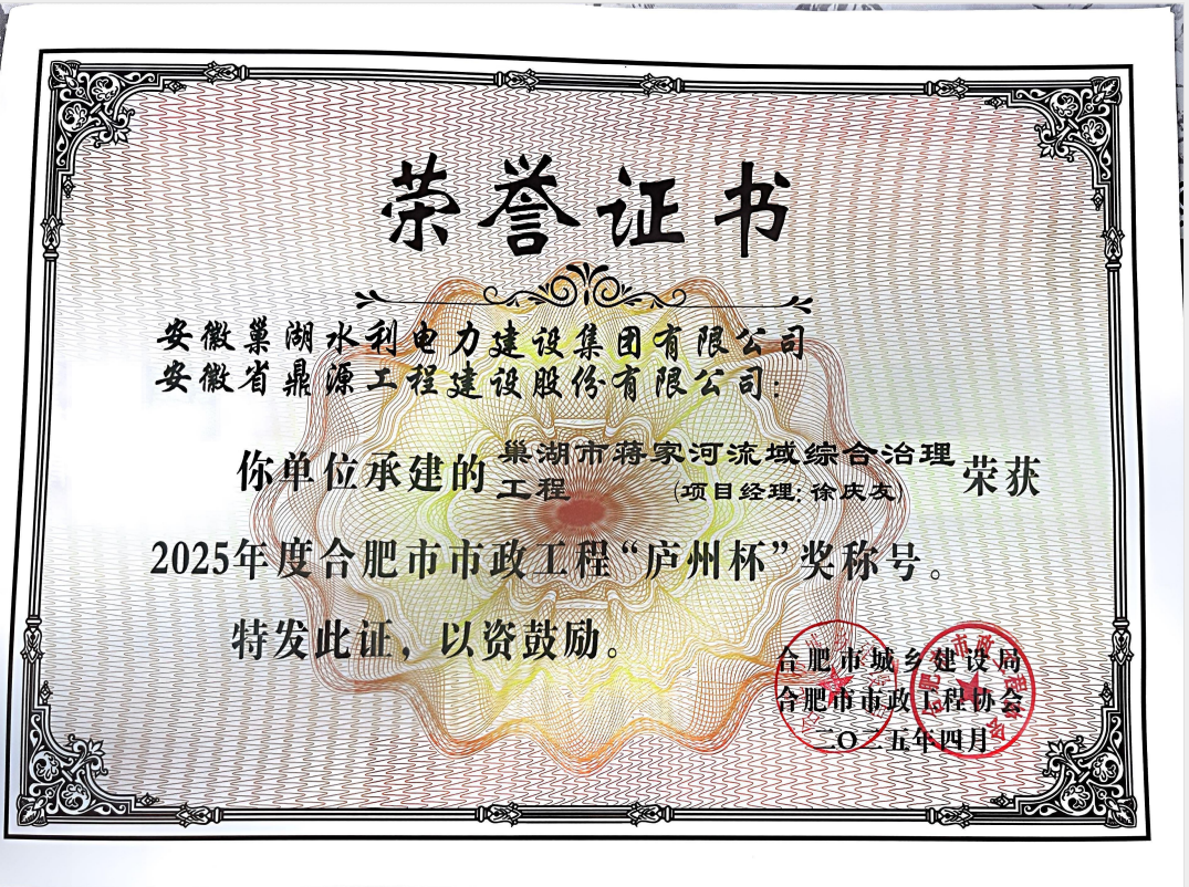 巢湖市蔣家河流域綜合治理工程榮獲“廬州杯”證書