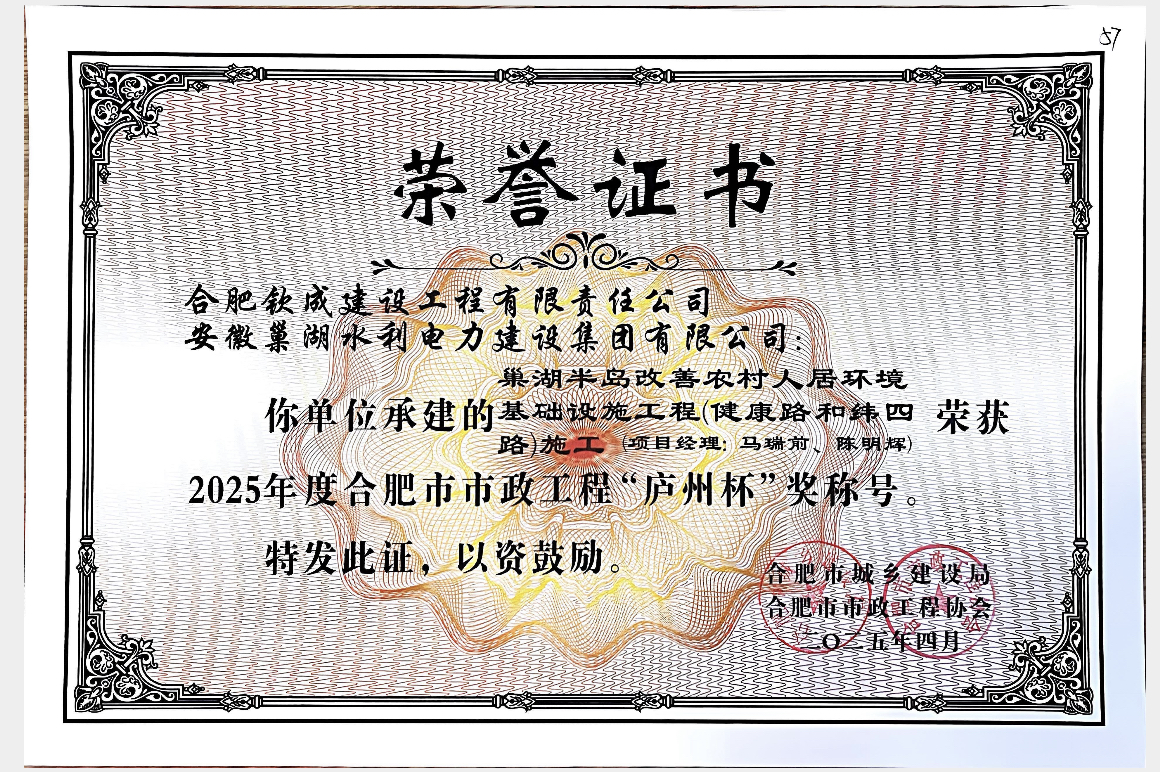 巢湖半島改善農(nóng)村人居環(huán)境基礎設施工程(健康路和緯四路)施工榮獲“廬州杯”證書