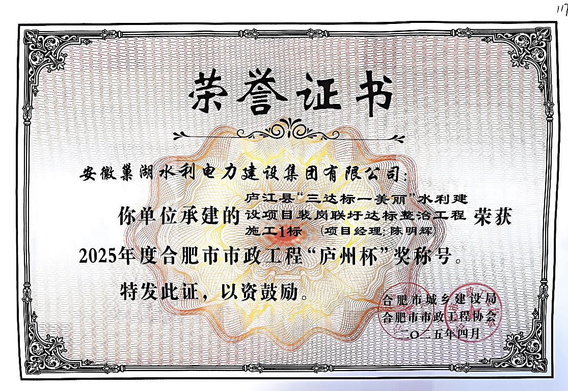 廬江縣“三達標一美麗”水利建設項目裴崗聯(lián)圩達標整治工程施工1標榮獲“廬州杯”證書